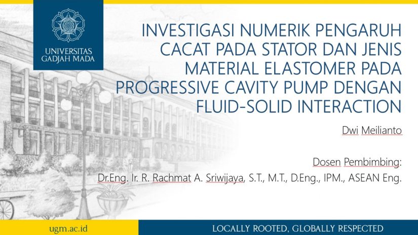 Mahasiswa Program Magister Teknik Mesin, Departemen Teknik Mesin dan Industri (DTMI) UGM, Dwi Meilianto, mengujikan proposal penelitian yang berfokus pada investigasi numerik pengaruh cacat stator dan jenis material elastomer terhadap kinerja Progressive Cavity Pump (PCP). Penelitian berjudul “Investigasi Numerik Pengaruh Cacat pada Stator dan Jenis Material Elastomer pada Progressive Cavity Pump dengan Fluid-Solid Interaction” ini diarahkan untuk mendukung peningkatan efisiensi dan keandalan peralatan industri, khususnya pada sektor pulp dan kertas, yang menuntut proses pemompaan fluida kimia secara stabil dan berkelanjutan. Ujian proposal ini dilaksanakan pada Rabu (14/01).