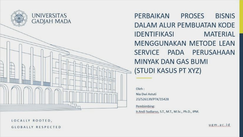Program Magister Teknik Industri, Universitas Gadjah Mada (UGM), kembali menyelenggarakan Seminar Hasil 2 pada Selasa (16/09). Kegiatan ini menampilkan presentasi dari Nia Dwi Astuti yang memaparkan penelitian berjudul “Perbaikan Proses Bisnis dalam Alur Pembuatan Kode Identifikasi Material Menggunakan Metode Lean Service pada Perusahaan Minyak dan Gas Bumi (Studi Kasus PT XYZ)”.
