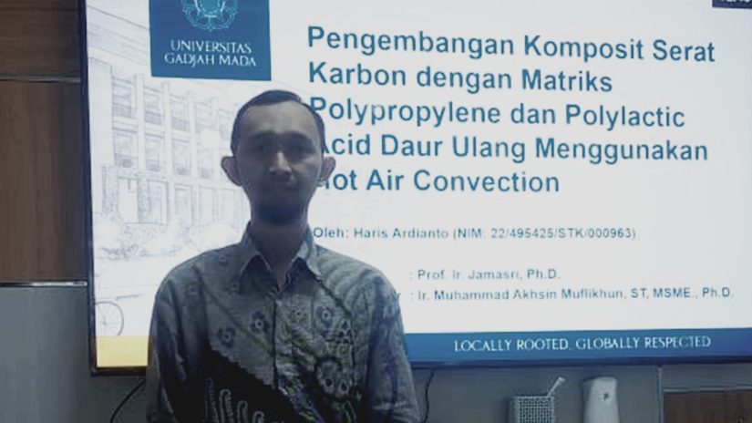 Program Studi Doktor Teknik Mesin, Departemen Teknik Mesin dan Industri (DTMI) UGM menggelar Seminar Hasil 1 untuk hasil riset disertasi Haris Ardianto bertajuk “Pengembangan Komposit Serat Karbon dengan Matriks Polypropylene dan Polylactic Acid Daur Ulang Menggunakan Hot Air Convection” pada Kamis (16/10). Penelitian ini dibimbing oleh Prof. Ir. Jamasri, Ph.D., IPU., ASEAN Eng. selaku promotor, serta Ir. Muhammad Akhsin Muflikhun, S.T., MSME., Ph.D. sebagai ko-promotor, dengan Prof. Dr.-Ing. Ir. Harwin Saptoadi, M.SE., IPM., ASEAN Eng. sebagai Ketua Program Studi.