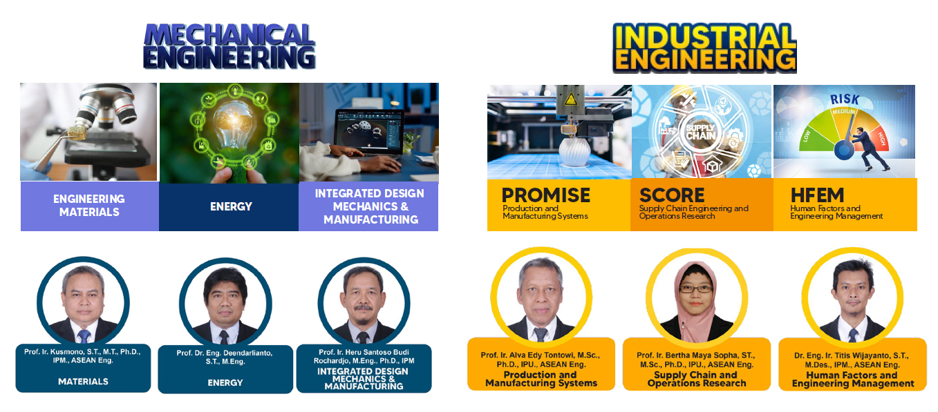 Kelompok Bidang Keahlian (KBK) Departemen Teknik Mesin dan Industri (DTMI) melakukan koordinasi serta melaksanakan kegiatan pengembangan dan penerapan ilmu pada Program Studi Teknik Mesin dan Teknik Industri. KBK ini menaungi beragam minat serta keahlian dosen, selain itu KBK mengelompokkan dosen-dosen dengan minat sejenis sehingga dapat mengembangkan ilmu pengetahuan dan teknologi secara optimal. Fungsi utama KBK mengatur regulasi pengajaran, penelitian, dan pengabdian kepada masyarakat secara berkelompok sesuai bidang keahlian. DTMI baik itu Teknik Mesin maupun Teknik Industri memiliki tiga KBK utama sebagai berikut: