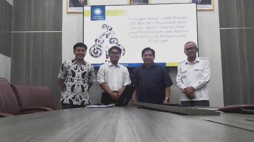 Departemen Teknik Mesin dan Industri (DTMI) UGM menyelenggarakan ujian tugas akhir bagi mahasiswa Program Magister Teknik Mesin pada Selasa (04/11), bertempat di Ruang Sidang A-3. Mahasiswa yang diuji adalah Eduardus Galih Putranto dengan judul penelitian “Investigasi Karakteristik Mekanis dari Ban Non-Pneumatik Jenis Jari-jari Sarang Lebah yang Menekankan pada Analisis Kelelahan yang Berbasis pada Regangan.” Tim penguji Eduardus terdiri dari Dr.Eng. Ir. R. Rachmat A. Sriwijaya, S.T., M.T., IPM. sebagai ketua tim penguji, dengan anggotanya yaitu Dr. Ir. Khasani, S.T., M.Eng., IPM., Dr. Indraswari Kusumaningtyas, S.T., M.Sc., dan Prastowo Murti, S.Si., M.Eng., Ph.D.