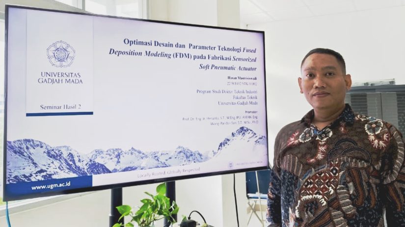 Program Doktor Teknik Industri, Departemen Teknik Mesin dan Industri (DTMI) UGM menyelenggarakan Seminar Hasil 2 pada Kamis (11/09). Seminar ini menghadirkan Hasan Mastrisiswadi, dosen Teknik Industri UPN “Veteran” Yogyakarta, yang memaparkan disertasinya berjudul “Optimasi Desain dan Parameter Teknologi Fused Deposition Modeling (FDM) pada Fabrikasi Sensorized Soft Pneumatic Actuator.”
