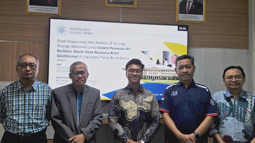 Zaky Ahmad Aditya, mahasiswa Program Magister Teknik Mesin, Departemen Teknik Mesin dan Industri (DTMI) UGM, melaksanakan ujian proposal tugas akhir dengan judul “Studi Eksperimen dan Analisis 3E (Energi, Eksergi, Ekonomi) pada Sistem Pemanas Air Berbasis Waste Heat Recovery Brine Geothermal di Lapangan Panas Bumi Dieng.” Ujian ini berlangsung pada Jumat (24/10), di Ruang Sidang B-1, Laboratorium Konversi Energi. Ujian proposal ini diuji oleh tim dosen yang terdiri dari Dr. Ir. Khasani, S.T., M.Eng., IPM. sebagai ketua penguji; Prof. Dr. Ir. Harwin Saptoadi, M.SE., IPM.; Ir. Fauzun, S.T., M.T., Ph.D., IPM., ASEAN Eng.; dan Ir. Indro Pranoto, S.T., M.Eng., Ph.D., IPM., ASEAN Eng.